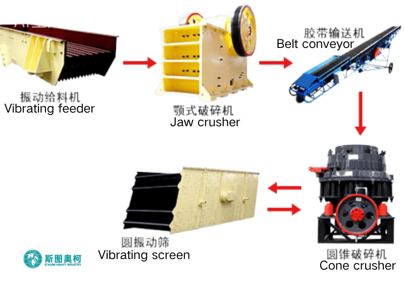A vibrating screen separates the crushed material; oversized particles are returned to the cone crusher for re-crushing, ensuring high efficiency and product uniformity.