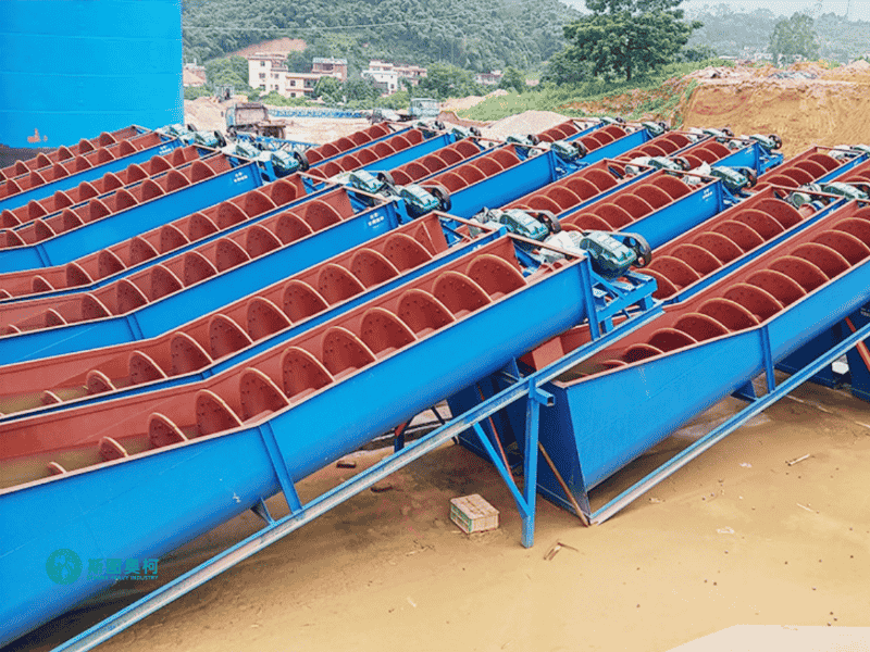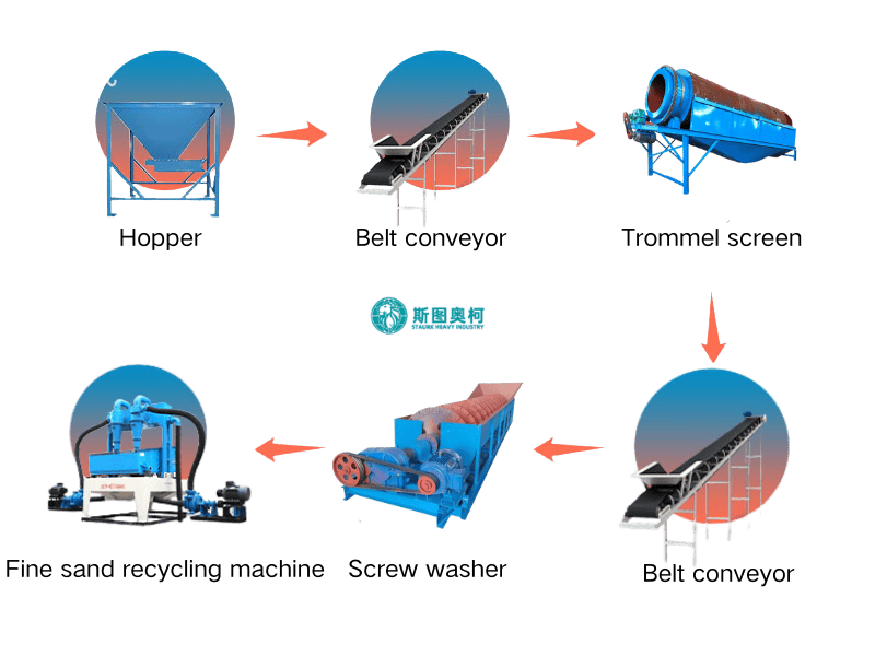 This sand washing production line begins with raw material being fed from a hopper onto a belt conveyor that transports it into a trommel screen where rotating drum action and high-pressure water sprays remove oversized debris (>5mm) and classify the material, after which the screened sand (0-5mm) is conveyed via another belt conveyor to a screw sand washer where counter-rotating screw blades vigorously agitate the sand in a water bath to scrub away residual clay and impurities through intense friction, with the cleaned sand then discharged while wastewater containing fine particles flows to a settling tank or hydrocyclone system for fine sand recovery and water recycling, ensuring high-purity sand output.